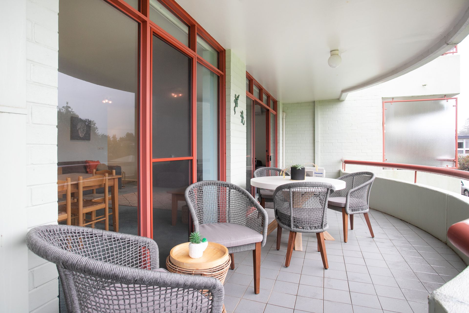 Balcony with BBQ, seating and Mollymook Beach views